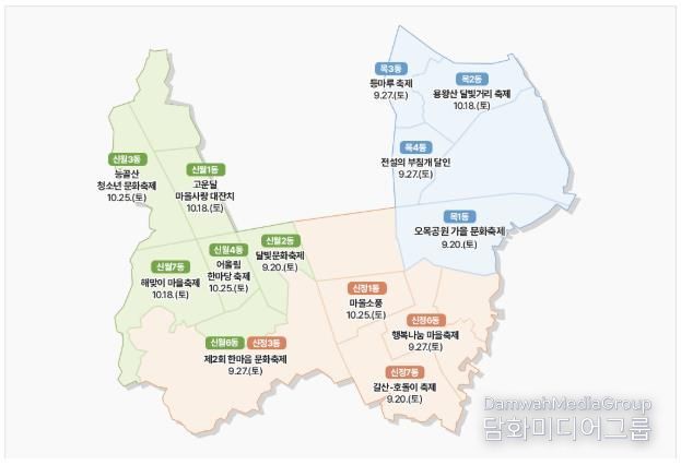 오는 20일에는 ▲목1동 ‘오목공원 가을 문화축제’ ▲신월2동 ‘달빛문화 축제’ ▲신정7동 ‘갈산·호돌이 축제’가 열리며, 본격적인 동 축제가 시작된다.