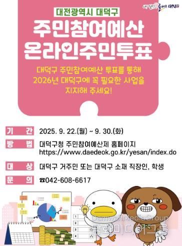 시민행정신문 강갑수 기자 | 대전 대덕구는 오는 22~30일 2026년 주민참여예산 사업 선정을 위한 온라인 주민투표를 진행한다고 16일 밝혔다.