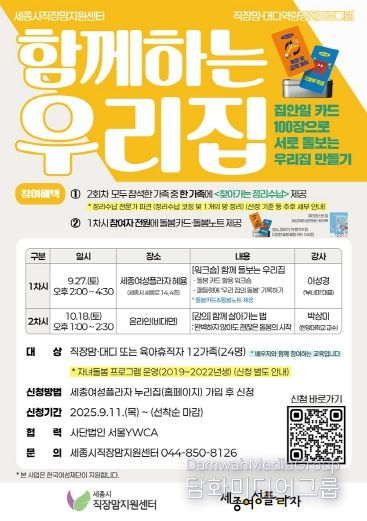 시민행정신문 강갑수 기자 | 세종시사회서비스원이 운영하는 세종시직장맘지원센터(대표 홍만희)는 오는 27일과 10월 18일 두 차례에 걸쳐 가족 참여 프로그램 ‘함께하는 우리집’을 운영한다고 밝혔다.