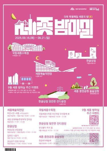 시민행정신문 기자 | (재)세종시문화관광재단(대표 박영국)이 오는 9월 16일부터 21일까지 6일간, 세종시를 문화와 낭만으로 물들일 ‘9월 세종 밤마실 주간’을 개최한다. 시민과 방문객 모두에게 잊지 못할 초가을의 밤마실 경험을 선사할 이번 행사는, 세종시의 밤을 활기와 감동으로 가득 채운다.
