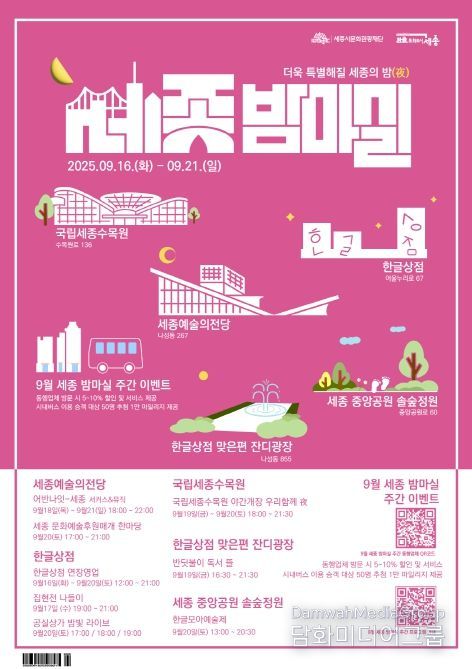 시민과 방문객 모두에게 잊지 못할 초가을의 밤마실 경험을 선사할 이번 행사는, 세종시의 밤을 활기와 감동으로 가득 채운다.