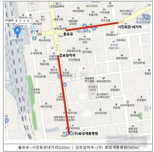 단속유예구간은 올포유 매장에서 시민회관 네거리까지 220m, 감초당 약국에서 옛 효성세종병원까지 360m이다.