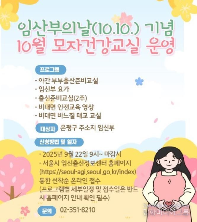 시민행정신문 강갑수 기자 | 서울 은평구는 10월 10일 ‘임산부의 날’을 기념해 보건소에서 임산부와 가족을 위한 다양한 모자건강교실을 운영한다고 밝혔다.