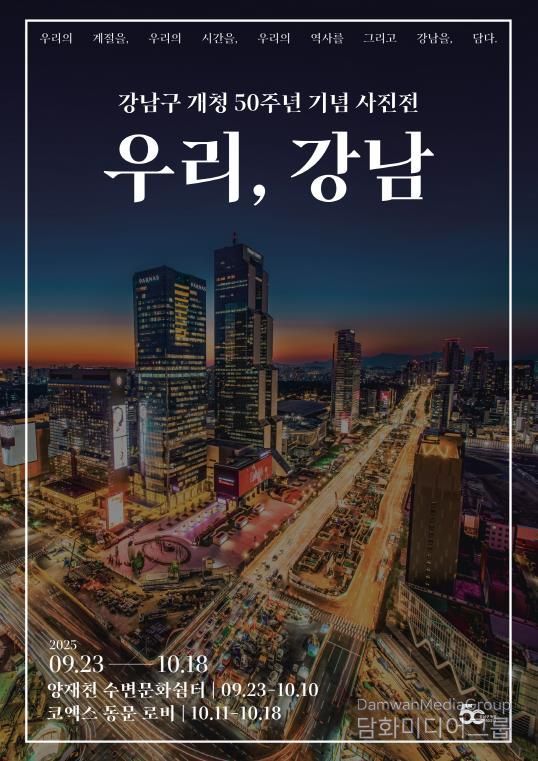 시민행정신문 이존영 기자 | 꿈이 모이는 도시, 미래를 그리는 강남구가 개청 50주년을 맞아 강남의 변화와 일상을 기록한 기념 사진전 ‘우리, 강남’을 연다. 전시는 9월 23일~10월 10일 양재천 수변문화쉼터, 이어 10월 11일~10월 18일 코엑스 동문 로비에서 야외 순회로 진행돼 더 많은 시민이 일상 동선에서 자연스럽게 관람할 수 있다.