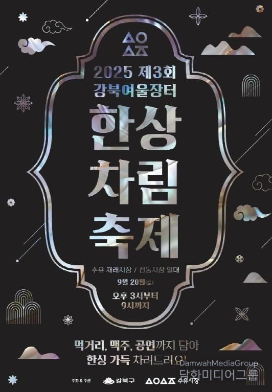 시민행정신문 이존영 기자 | 서울 강북구는 오는 9월 20일 오후 3시부터 저녁 9시까지 수유재래시장과 전통시장 일대(도봉로67길, 도봉로71길)에서 ‘강북 여울장터 '수유 한상차림 축제 둘째마당'’을 개최한다.