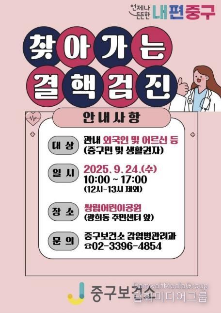 시민행정신문 강갑수 기자 | 서울 중구가 결핵 조기 발견과 감염 확산 방지를 위해 오는 24일(수) 오전 10시부터 오후 5시까지 광희동 주민센터 앞 쌍림어린이공원에서 '찾아가는 결핵검진'을 무료로 실시한다.