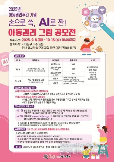 시민행정신문 이존영 기자 | 서대문구가 11월 셋째 주 아동권리주간을 기념해 10월 15일까지 ‘손으로 쓱, AI로 짠! 2025년 아동권리 그림 공모’를 진행한다.