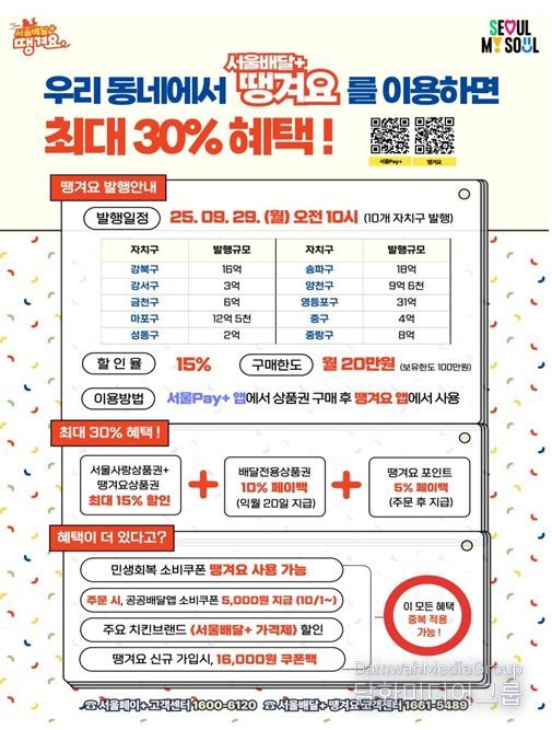 ' 29일(월)부터 ‘자치구 배달전용상품권’ 110억 규모 발행… ‘서울페이+’ 앱에서 15% 할인 판매'