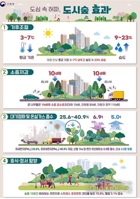 숲 1ha는 이산화탄소 연간 6.9톤, 미세먼지 168㎏ 등 대기 오염물질을 흡수하고(국립산림과학원), 도시숲은 여름 한낮 평균기온을 3~7℃ 낮춰주는 효과가 있다(산림청)는 연구 결과가 있다.