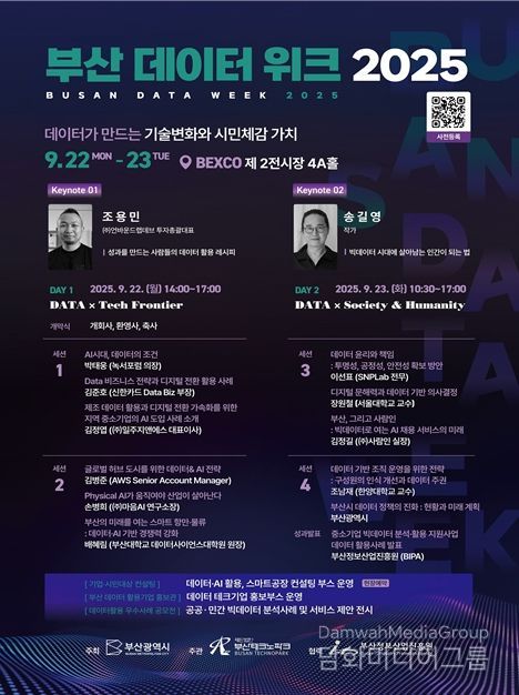 또한, 2일 차에는 부산시 빅데이터혁신센터 사업 참여기업인 ▲허슬러즈 ▲링스업 등이 직접 우수사례를 발표하며, '2025년 중소기업 빅데이터 분석·활용 지원 사업' 등 2025년 시가 추진한 데이터 생태계 조성 성과도 공유한다.