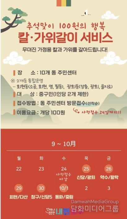 칼갈이는 △9월 25일 신당동누리센터와 광희동 주민센터 △26일 황학동과 약수동 주민센터 △29일 회현동과 다산동 주민센터 △30일 청구동과 신당5동주민센터 △10월 1일 동화동과 중림동주민센터에서 차례대로 운영한다. 운영시간은 오후 1시부터 6시까지다.