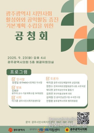 시민행정신문 강갑수 기자 | 광주광역시는 23일 오후 4시 광주광역시의회 5층 예결위회의실에서 ‘광주광역시 시민사회 활성화와 공익활동 증진을 위한 기본계획(제1차, 2026~2028)’ 최종보고회 겸 공청회를 개최한다.