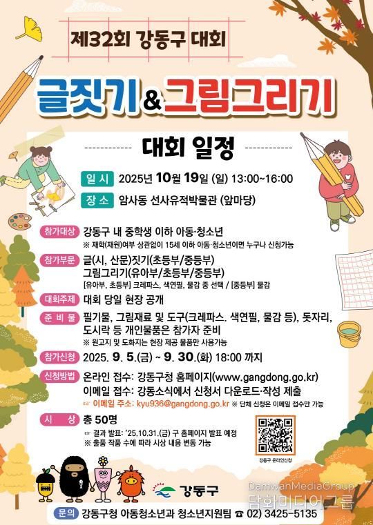 시민행정신문 이존영 기자 | 강동구는 오는 10월 19일 암사동 선사유적박물관에서 '제32회 강동구 아동·청소년 글짓기 및 그림그리기 대회'를 개최한다고 밝혔다.