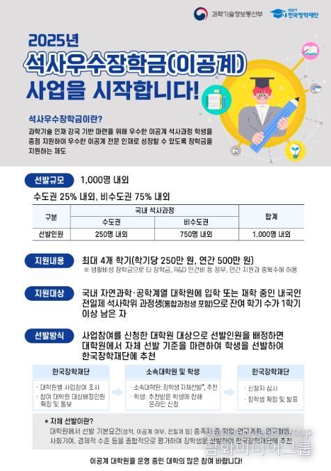 시민행정신문 강갑수 기자 | 과학기술정보통신부와 한국장학재단은 2025년도 이공계 석사우수장학금 장학사업을 올해 처음으로 시행한다고 밝혔다. 이공계 석사우수장학금은 사업 참여 신청을 한 대학원의 소속 학생 중 장학생을 선발하며, 대학원 사업 참여 신청 기간은 9월 19일부터 10월 2일까지이다.