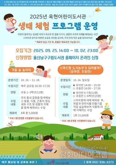 시민행정신문 강갑수 기자 | 남구 옥현어린이도서관은 어린이들을 위한 ‘2025년 생태 체험프로그램’을 오는 10월 10일부터 11월 28일까지 운영한다고 밝혔다.