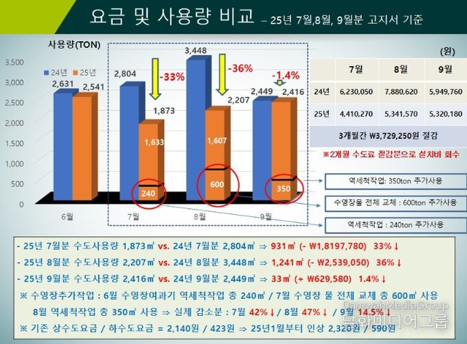 성과 분석 결과, 7월 수도 사용량은 전년 동월 대비 33%(931㎥) 절감, 8월은 36%(1,241㎥) 절감됐다.