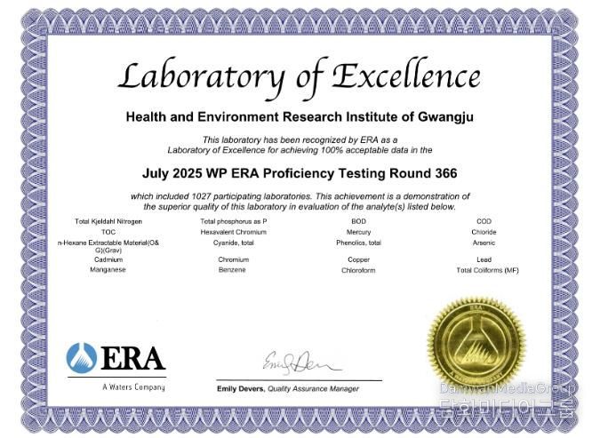 시민행정신문 강갑수 기자 | 광주광역시 보건환경연구원이 최근 미국 환경자원협회(ERA)가 주관한 수질분야 국제 숙련도시험에서 전 항목 ‘만족(Satisfactory)’ 판정을 받아 ‘2025 최우수 분석기관(Laboratory of Excellence)’으로 선정됐다.
