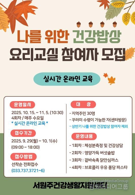 모집 인원은 온라인 수업이 가능한 지역 주민 30명이며, 참여 신청은 9월 29일부터 10월 1일 전화로 선착순 접수한다. 단, 상반기 같은 과정 참여자는 신청이 제한된다.