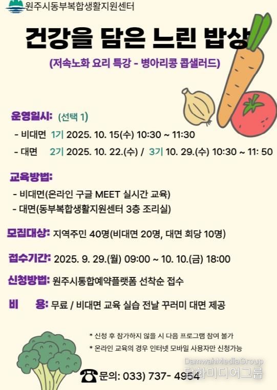 시민행정신문 강갑수 기자 | 원주시동부복합생활지원센터는 오는 29일부터 저속노화 요리 특강 ‘건강을 담은 느린 밥상’ 프로그램 참여자를 모집한다.