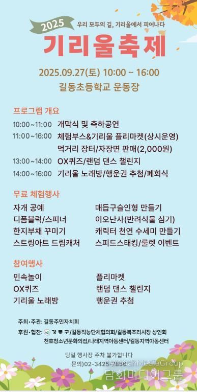 시민행정신문 이존영 기자 | 강동구 길동은 오는 27일 10시부터 16시까지 길동초등학교 운동장에서 주민 화합을 위한 ‘2025 기리울 축제’가 열린다고 밝혔다.