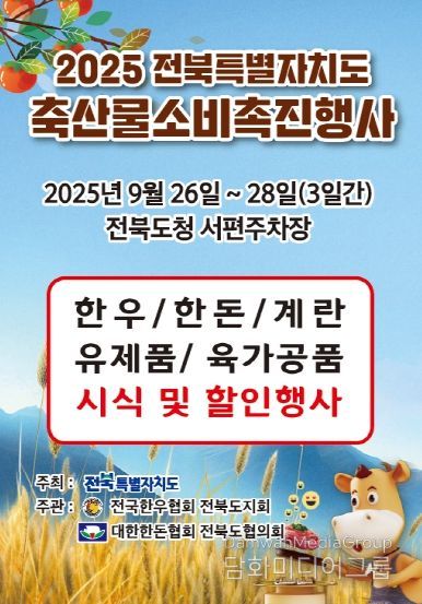 시민행정신문 이세훈 기자 | 전북특별자치도가 추석 명절을 맞아 도민들에게 안전하고 품질 좋은 축산물을 저렴하게 제공하기 위해 ‘2025년 축산물 소비촉진행사’를 연다. 도는 이번 행사를 9월 26일부터 28일까지 사흘간 도청 서편광장에서 개최한다고 23일 밝혔다.