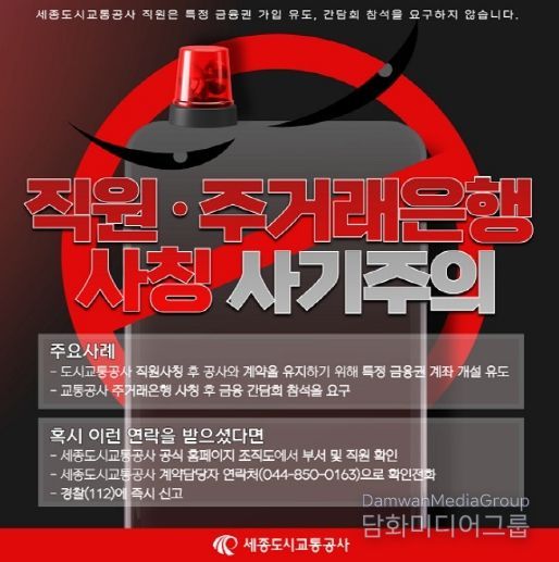 시민행정신문 강갑수 기자 | 세종도시교통공사는 최근 공사 임직원을 사칭하는 사기 사례가 확인됨에 따라 시민과 협력업체에 각별한 주의를 당부했다.