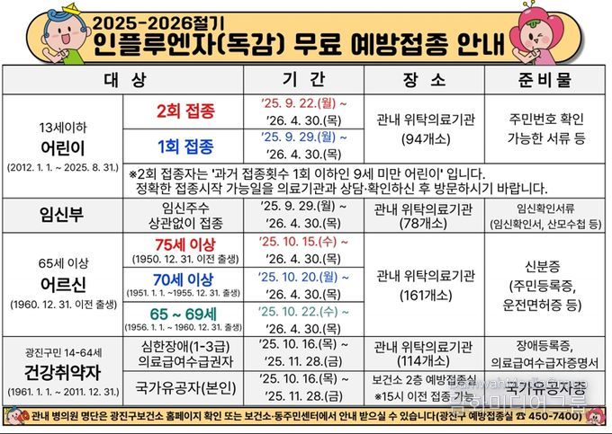 시민행정신문 이존영 기자 | 광진구는 겨울철 호흡기 감염병 확산을 예방하고 구민 건강을 보호하기 위해 인플루엔자 무료 예방접종을 실시한다.