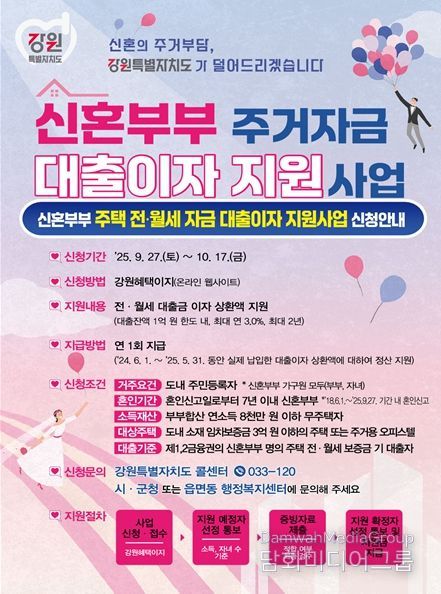 시민행정신문 강갑수 기자 | 강원특별자치도는 9월 27일부터 10월 17일까지 '신혼부부 주거자금 대출이자 지원사업' 대상자를 3차 모집한다고 밝혔다.