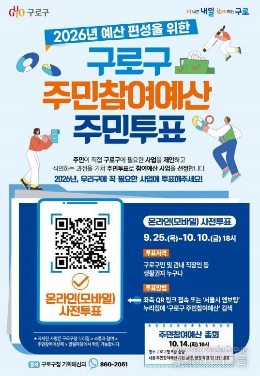 시민행정신문 강갑수 기자 | 구로구가 오는 25일 오전 9시부터 10월 10일 오후 6시까지 ‘2026년 주민참여예산 사업’ 선정을 위한 온라인 투표(엠보팅)를 실시한다.
