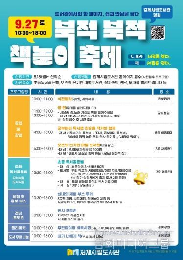 이번 축제는 9월 독서의 달과 연계해 진행되는 가을 독서 문화 행사로, 도서관에 대한 이해와 관심을 높이고 이용을 촉진하기 위해 김제시공립작은도서관 연합회, 어린이도서연구회, 어린이집, 학교 등 지역사회와 함께 다양한 프로그램을 운영한다.