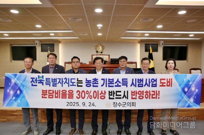 시민행정신문 강갑수 기자 | 장수군의회는 24일 본회의장에서 의원 전원이 참석한 가운데 농어촌 기본소득 국가 시범사업 추진 과정에서 도비 분담비율을 반드시 30% 이상 반영할 것을 전북특별자치도에 강력히 촉구했다.
