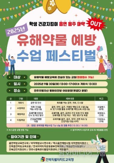 전북교육청은 오는 30일 전주 치명자산 평화의전당 야외광장에서 ‘2025. 유해약물 예방 수업 페스티벌’을 개최한다고 24일 밝혔다.