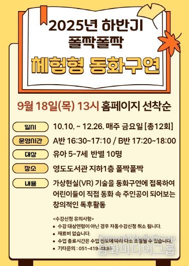 시민행정신문 강갑수 기자 | 부산 영도도서관이 2025년 하반기 동안 아이들을 위한 특별한 독서 문화 프로그램, ‘폴짝폴짝 체험형 동화구연'을 운영한다.