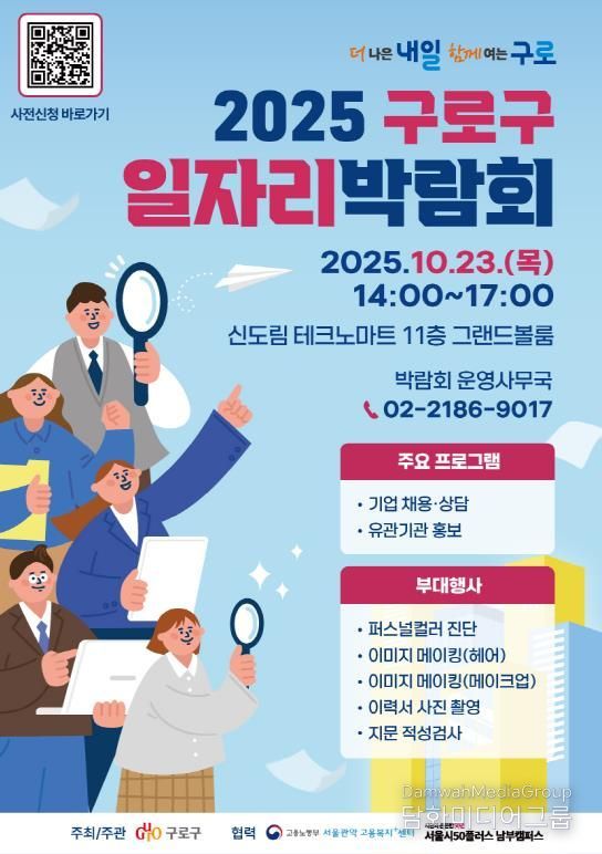 아울러 구는 9월 16일부터 10월 23일까지 행사 당일 혼잡을 줄이기 위해 참여를 원하는 구직자 대상으로 사전등록을 운영하며, 포스터의 큐알(QR)코드를 통해 신청하면 된다.
