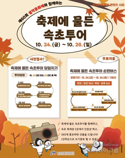 시민행정신문 강갑수 기자 | (재)속초문화관광재단은 제60회 설악문화제를 맞아 수도권 시민들이 가을 정취 가득한 속초의 대표 축제들을 한 자리에서 체험할 수 있도록 특별 기획된 문화관광 콘텐츠 ‘축제에 물든 속초투어’를 운영한다.