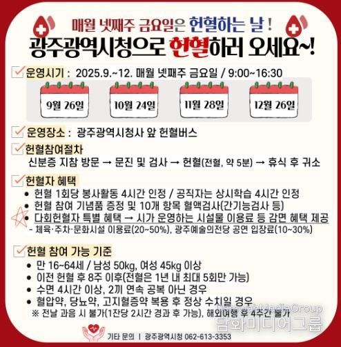 광주시는 올해 9월부터 12월까지 매월 넷째 주 금요일을 ‘헌혈 참여의 날’로 정하고, 대한적십자사 광주·전남혈액원과 협력해 오전 9시부터 오후 4시30분까지 청사 앞 시민광장에 헌혈버스를 배치·운영한다.