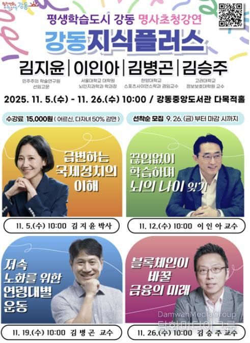 이수희 강동구청장은 “급변하는 사회 속에서 새로운 지적 통찰과 지속 가능한 삶의 지혜를 나누는 장으로 마련했다”라며 “서울 자치구 최대이자 인문예술 특화 도서관인 강동중앙도서관에서 열리는 특강인 만큼, 구민들이 미래 사회를 준비할 수 있는 귀중한 지적 자산을 얻게 되길 기대한다”라고 말했다.
