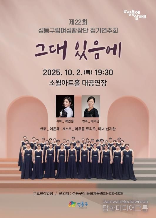 시민행정신문 이존영 기자 | 서울 성동구는 오는 10월 2일 저녁 7시 30분 소월아트홀에서 성동구립 여성합창단 '제22회 정기 공연'을 개최한다고 밝혔다. 공연 부제는 '그대 있음에'로 가을밤, 구민들에게 사랑과 위로의 하모니를 선사할 예정이다.