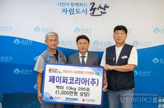 시민행정신문 강갑수 기자 | 군산시는 페이퍼코리아㈜(대표이사 권육상)가 다가오는 추석, 어려운 이웃을 위해 백미10㎏ 295포(1천만 원 상당)를 기탁했다고 25일 밝혔다.