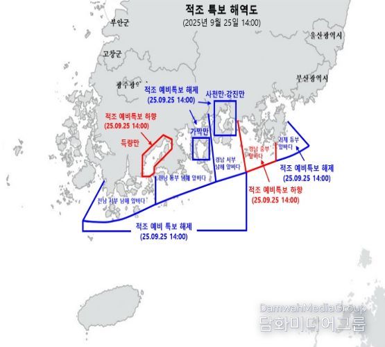 이는 국립수산과학원이 경남 중부앞바다와 득량만 2개 해역에 내려진 적조 주의보를 예비특보로 낮추고, 나머지 6개 예비특보 해역을 모두 해제한 데 따른 조치이다.