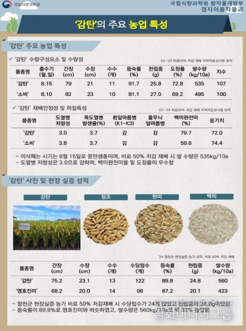 ‘감탄’은 비료 사용량을 절감하고 메탄 발생을 줄이는 그린라이스 품종으로, 비료를 50% 줄여도 수확량 감소가 약 7%에 불과하다. 밥맛이 우수하고 병해에도 강해 친환경 농업에 적합하다는 평가를 받고 있다.