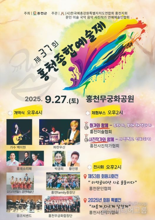 시민행정신문 강갑수 기자 | 홍천군이 주최하고 (사)한국예총홍천지회(회장 백금산)와 산하 6개 지부(문인, 미술, 국악, 음악, 사진작가, 연예예술인협회)가 주관하는 '제37회 홍천종합예술제'가 오는 9월 27일 오후 4시 홍천무궁화공원에서 성대하게 개막한다.