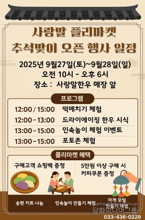 특히, 플리마켓 오픈 기념으로 민속놀이, 떡메치기 체험과 함께 다양한 이벤트를 진행할 예정이다.