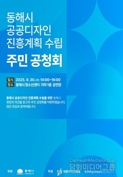 시민행정신문 강갑수 기자 | 동해시는 시민과 함께하는 열린 정책 수립을 위해 '동해시 공공디자인 진흥계획(안)' 공청회를 오는 9월 30일 오후 2시, 동해시 청소년센터 1층 공연장에서 개최한다고 밝혔다.