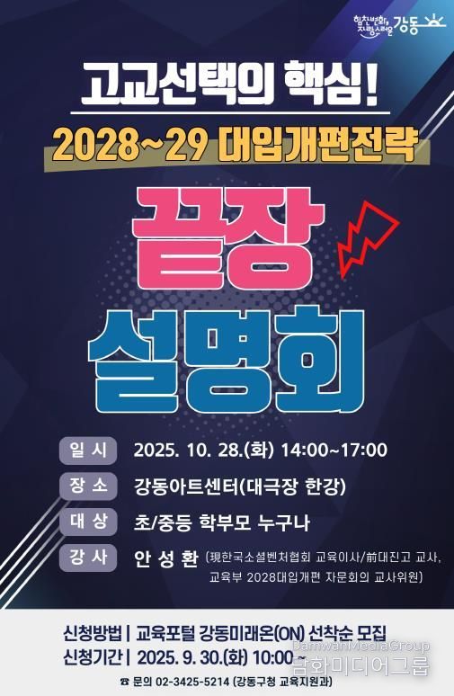 시민행정신문 강갑수 기자 | 강동구는 오는 10월 28일 강동아트센터 대극장 한강에서 열리는 “고교선택의 핵심! 2028~2029 대입개편전략 끝장설명회”의 참가 신청을 오는 9월 30일 오전 10시부터 접수한다고 밝혔다.