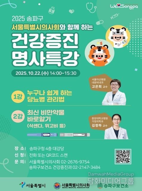 시민행정신문 이존영 기자 | 송파구가 오는 10월 22일 14시에 송파구청 대강당에서 서울아산병원 내분비내과 고은희 교수와 중앙대학교병원 가정의학과 김정하 교수가 진행하는 ‘송파구 건강증진 명사 특강’을 개최한다고 밝혔다.