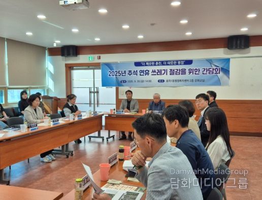 시는 26일 효자1동 행정복지센터에서 '추석 연휴 쓰레기 절감을 위한 간담회'를 열고, 연휴 기간 쓰레기 배출과 수거 관리 방안을 논의했다. 이번 간담회에는 춘천시이통장연합회, 주민자치협의회, 새마을운동 단체, 바르게살기운동협의회, 외식업중앙회 춘천지부, 주택관리사협회, 상업경영인연합회, 생활폐기물협회 등 시민 생활과 밀접한 단체 관계자 12명이 참석했다.