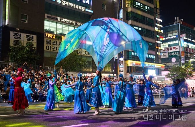 천안흥타령춤축제의 대표 프로그램인 거리퍼레이드는 오후 7시부터 방죽안오거리~신세계백화점 천안아산점 일대 550m 구간 9차선 도로에서 펼쳐졌다.