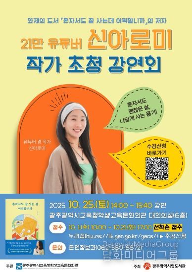 이날 신 작가는 ‘혼자서도 괜찮은 삶, 나답게 사는 용기‘를 주제로 광주시민들에게 싱글라이프와 자기 존중의 가치에 대한 이야기를 들려주고, 소통하는 시간도 갖는다.