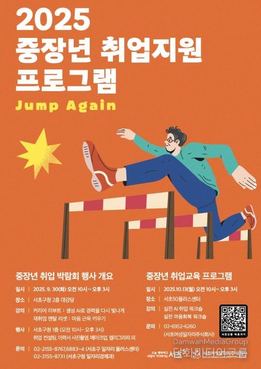 시민행정신문 이존영 기자 | 서울 서초구는 중장년의 구직 활동을 응원하기 위해 오는 30일 취업지원 프로그램 ‘점프 어게인(JUMP AGAIN)’을 개최한다고 밝혔다.